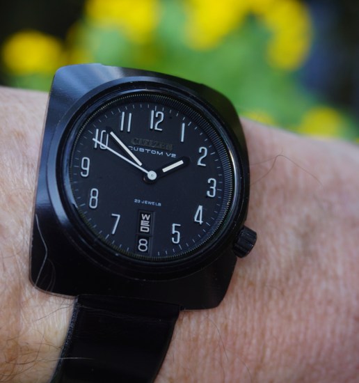 I’ve gone for Citizen’s first watch with a black coated case today – this model was launched in 1970 and mine is from March of that year. Using the 7290 movement, with 23 jewels and second setting (‘hacking’) this model was offered with two colour schemes, and this is the monochrome version. The case number is 4-720083. The alloy case is 30% lighter than stainless steel, and Citizen described the coating as more resistant to wear than stainless steel. The dial is very easy to read, with its raised hour markers and clearly contrasting hand set: